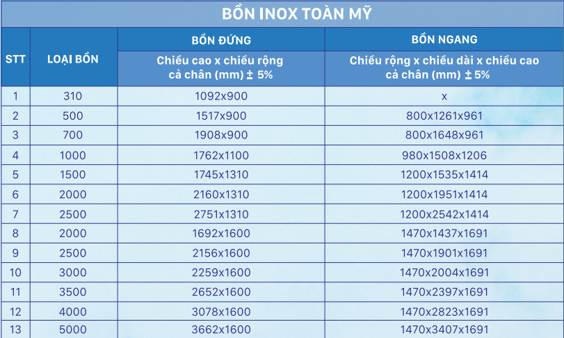 Chất liệu Inox SUS 304 đảm bảo an toàn vệ sinh thực phẩm cho người dùng. Bồn nước inox Toàn Mỹ chỉ thích hợp cho nguồn nước sạch, không thích hợp sử dụng cho nơi nhiễm phèn; nhiễm mặn. Tìm hiểu thêm về ưu và nhược điểm giữa bồn inox và bồn nhựa.